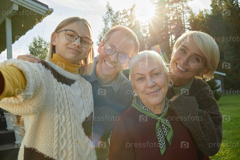 Портрет семьи, улыбающейся на открытом воздухе в солнечный осенний день
