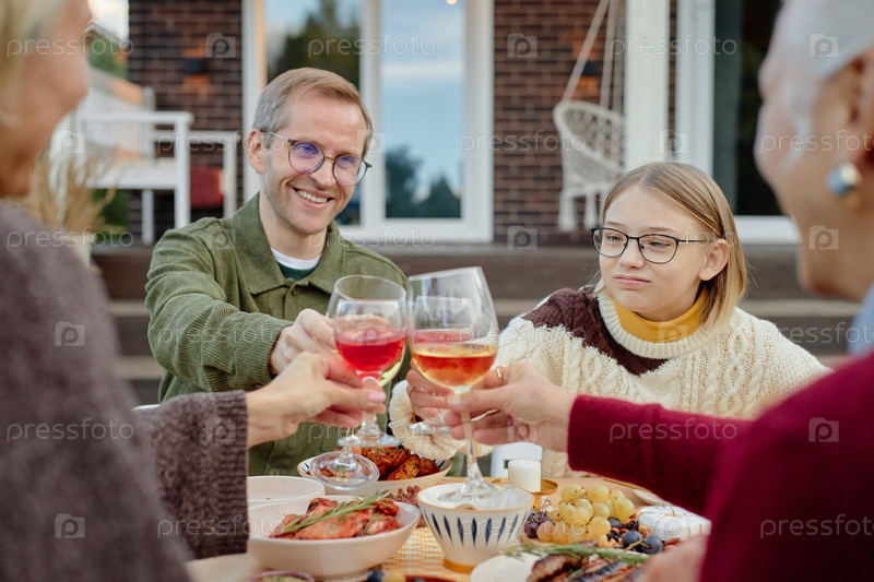 Мужчина среднего возраста и подросток тостят за напитки во время встречи на открытом воздухе