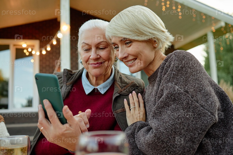 Пожилая женщина и женщина среднего возраста улыбаются, используя смартфон