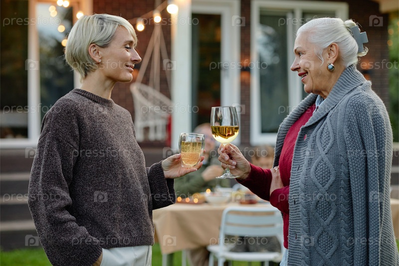Женщина тостирует вино со старшей матерью на открытом воздухе