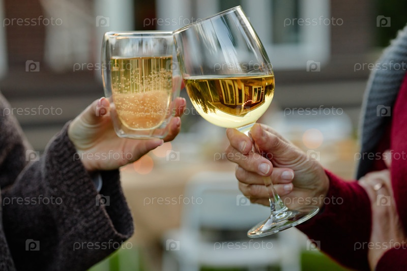 Женщины среднего возраста, тостирующие бокалы с вином во время открытого собрания