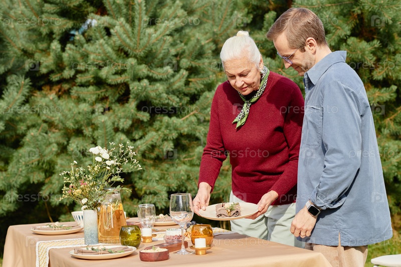Старшая женщина устанавливает столик на открытом воздухе со своим сыном