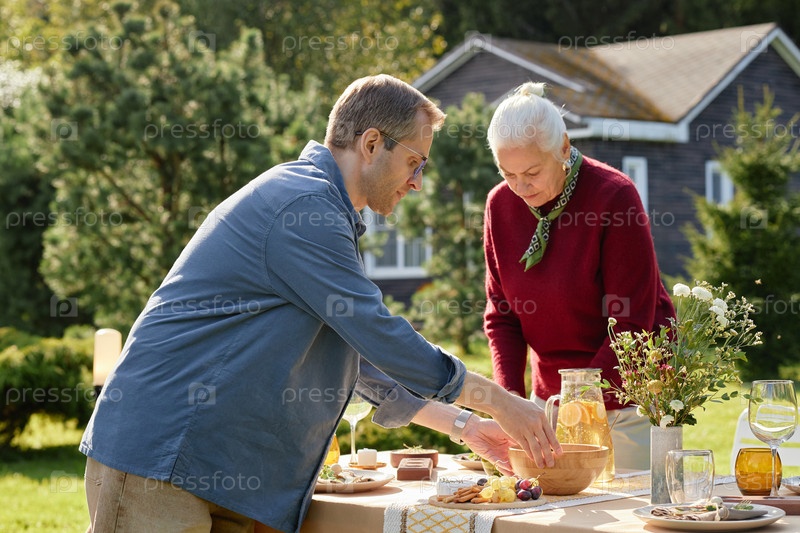Молодой человек и пожилая женщина готовят обед на улице