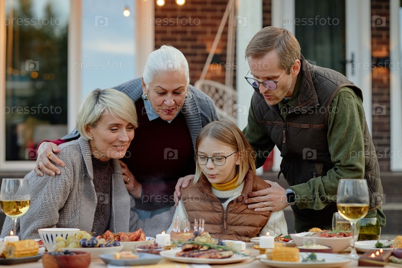 Семья собирается за столом, празднуя день рождения на свежем воздухе