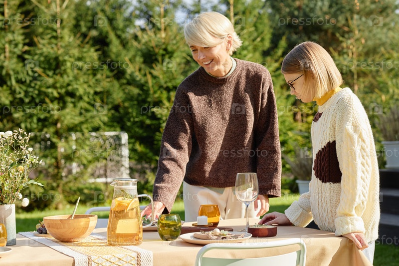 Женщина среднего возраста и девочка-подросток вместе устанавливают столик на открытом воздухе