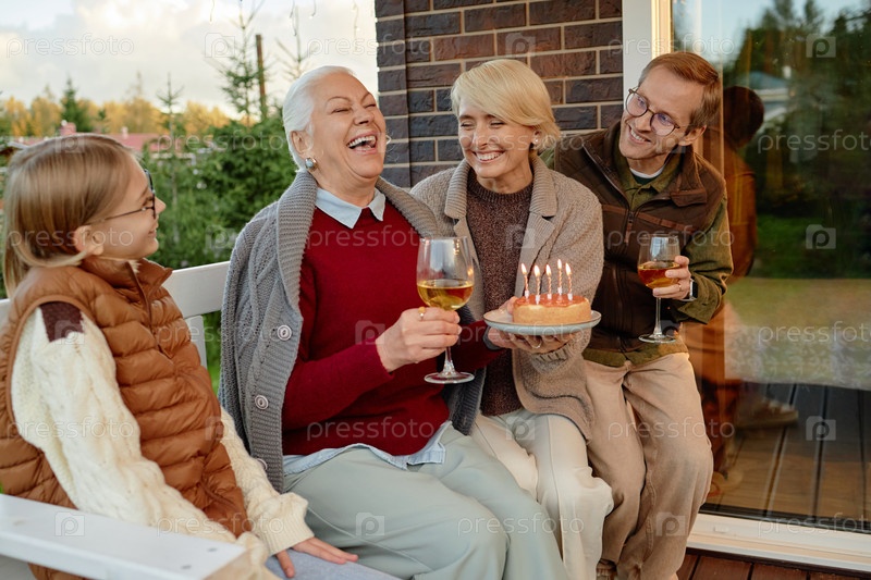 Старшая женщина празднует день рождения с семьей на открытом воздухе, улыбаясь