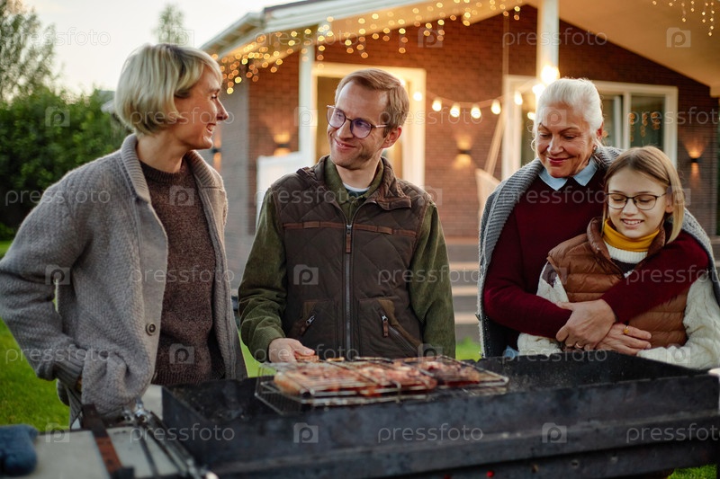 Мужчина средних лет жаря еду на свежем воздухе с семьей