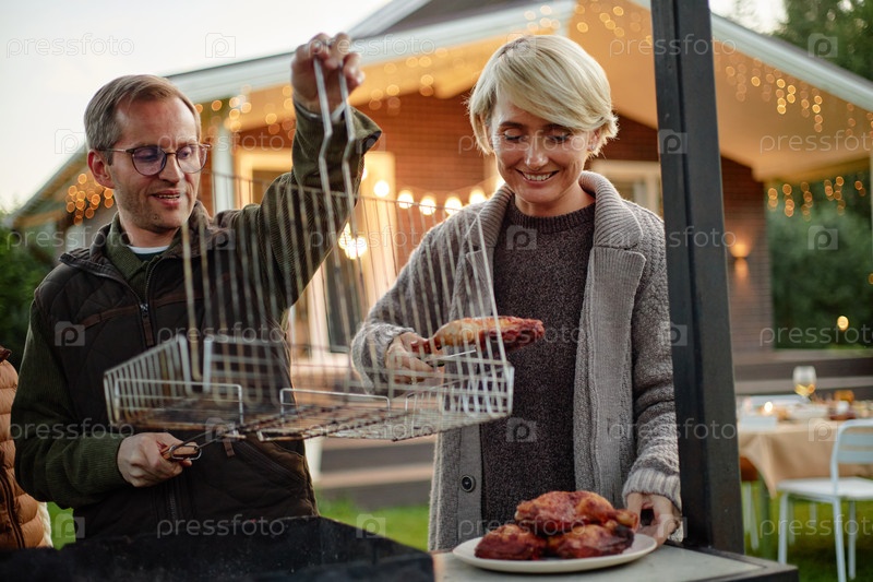Мужчина и женщина средних лет жарят мясо на свежем воздухе в заднем дворе
