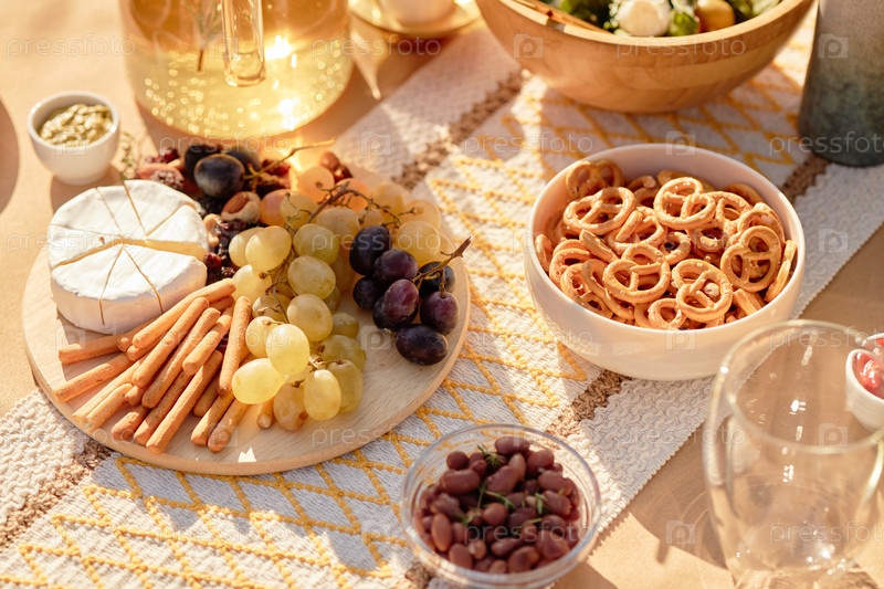 Разнообразные закуски и фрукты расположены на столе во время открытого собрания