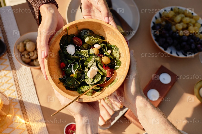 Женщина и мужчина делятся свежим салатом во время встречи на открытом воздухе