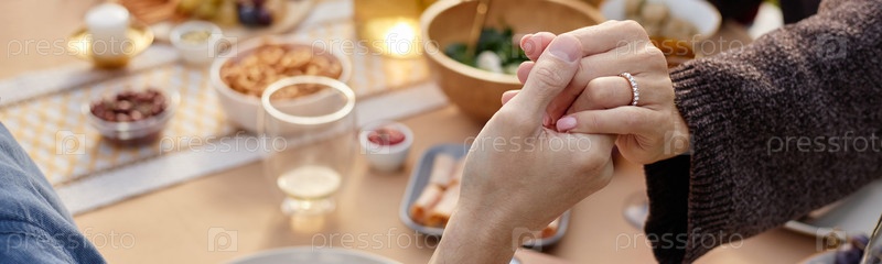 Header of Женщина среднего возраста, держащаяся за руку с мужчиной за столом