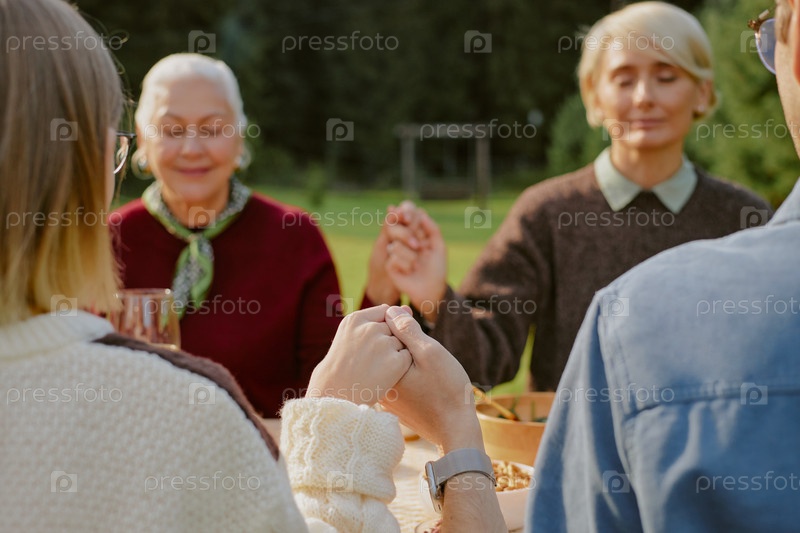 Семья держит друг друга за руки и молится за обеденным столом на улице