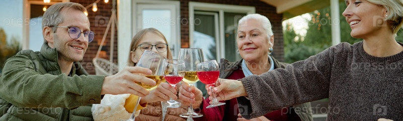 Заголовок семейного тостирования бокалов вина на открытом воздухе во время осеннего собрания