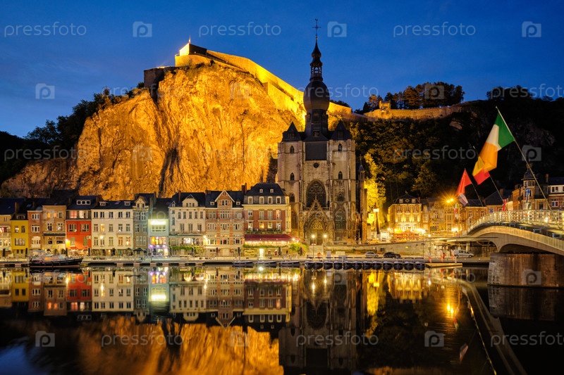 Ночные виды на город Динан, университетскую церковь Нотр-Дам де Динан над рекой Мауза и мост Шарля де Голля и Цитадель Динан освещаются вечером