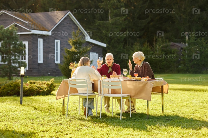 Женщины и девочки наслаждаются обедом на свежем воздухе и беседой в саду