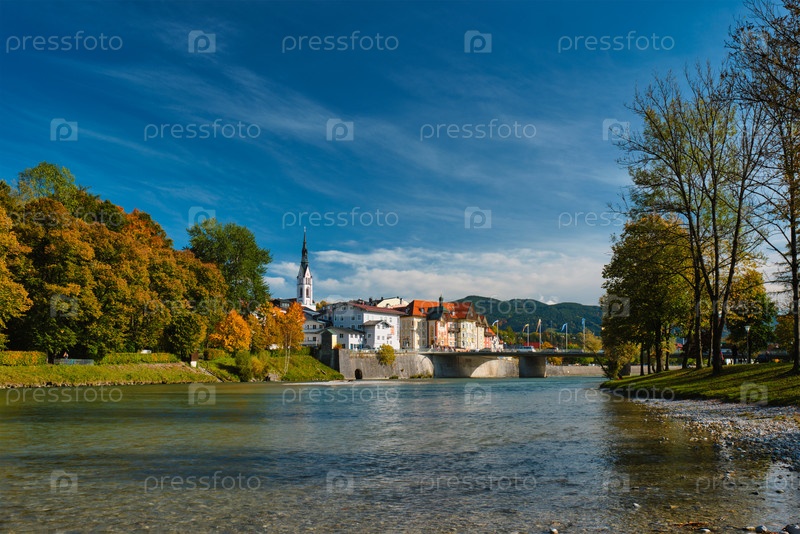 Бад-Толц живописный курортный город в Баварии, Германия осенью и река Исар