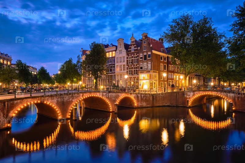 Амстердамский канал, мост и средневековые дома вечером