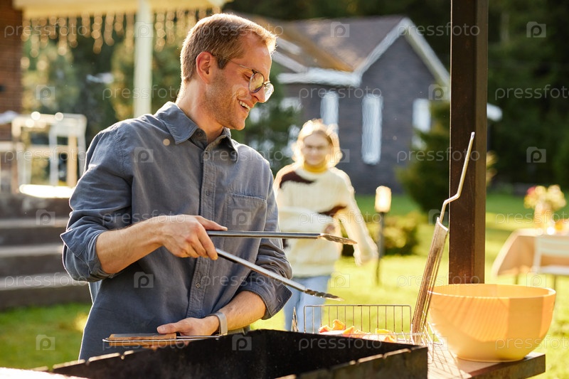 Мужчина, который жаря еду на свежем воздухе улыбается во дворе собрания