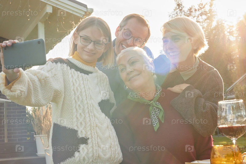 Девушка делает селфи с семьей на открытом воздухе, улыбаясь