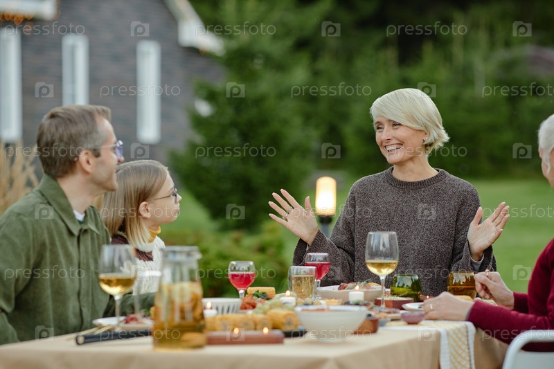 Женщина среднего возраста жестикулирует, общаясь с семьей на свежем воздухе