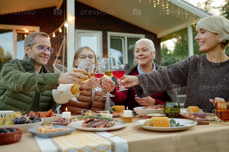 Семья из четырех тостирующих стаканов во время встречи на открытом воздухе