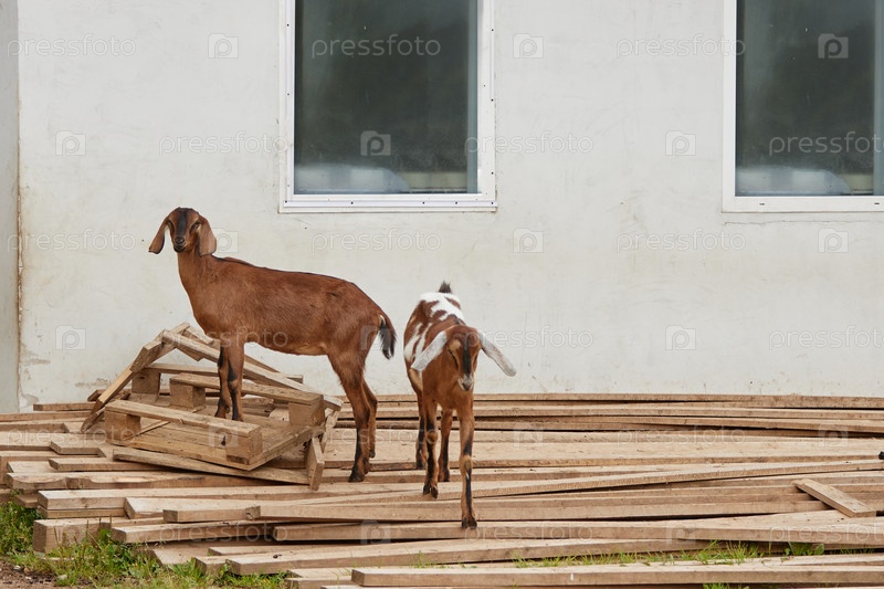 Две козы стоят на деревянных досках возле здания во время дня