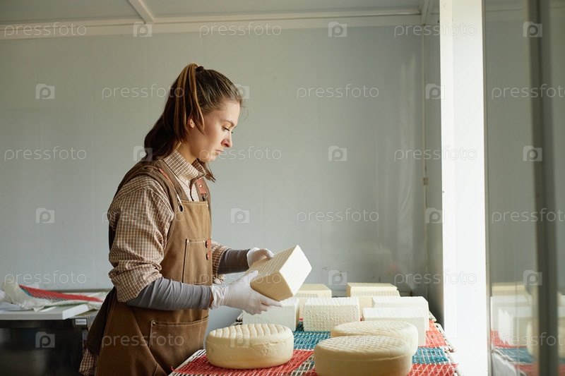 Молодая взрослая женщина инспектирует сырные колёса на молочном заводе