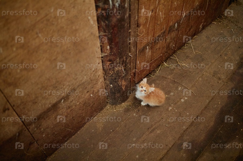 Имбирный котенок сидит на деревянном полу и смотрит вверх в рустическом саду