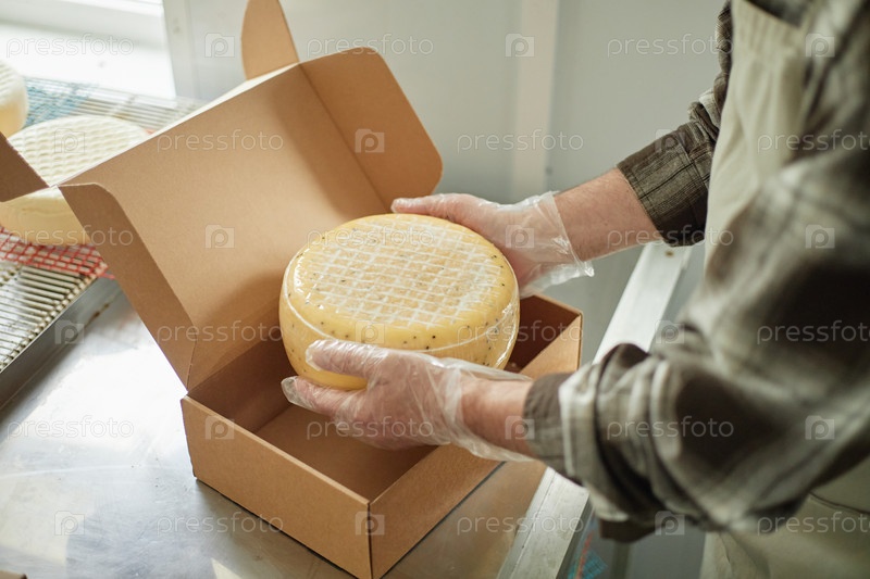 Человек среднего возраста упаковывает круглое сырное колесо в картонную коробку