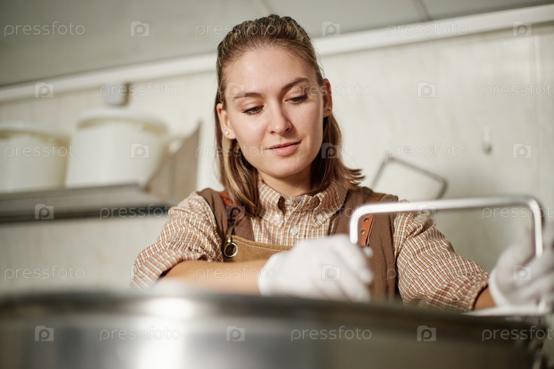 Молодая взрослая женщина готовит еду на промышленной кухне