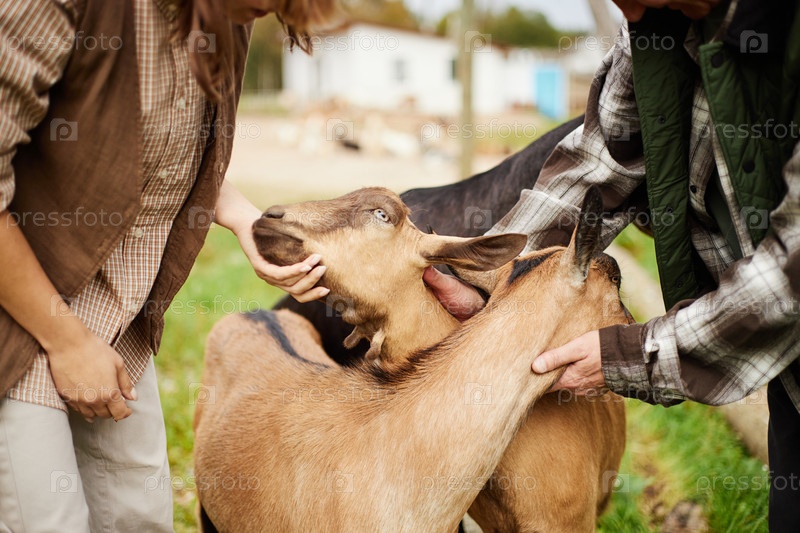 Молодая женщина и мужчина среднего возраста ласкают козлов на открытом воздухе