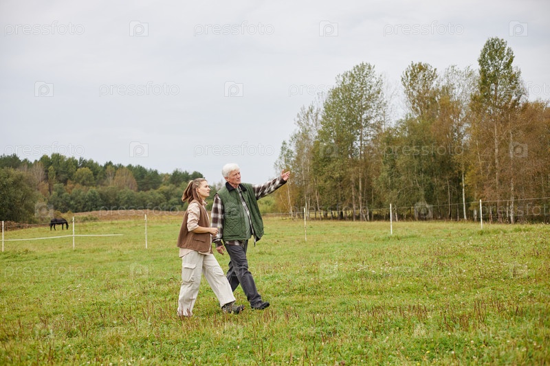 Старший мужчина и молодая женщина гуляют на свежем воздухе и наслаждаются природой