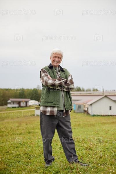 Старший мужчина, стоящий на улице и улыбающийся с перекрещенными руками