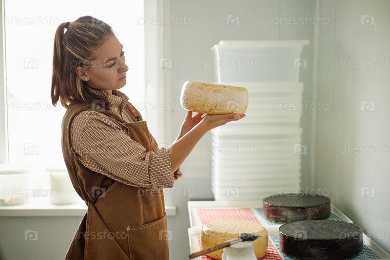 Молодая женщина инспектирует колесо сыра в мастерской ремесленников по производству молока