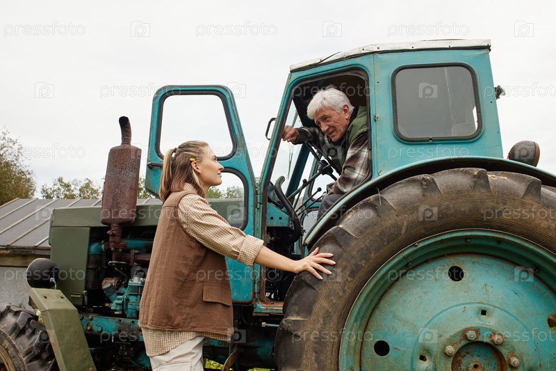 Старший мужчина разговаривает с молодой взрослой женщиной возле трактора
