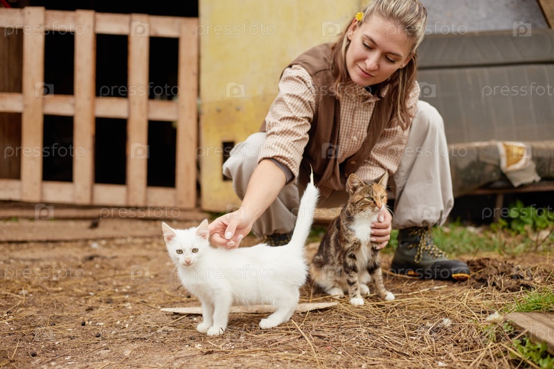 Молодая женщина ухаживает за котенком и коткой Табби на открытом воздухе