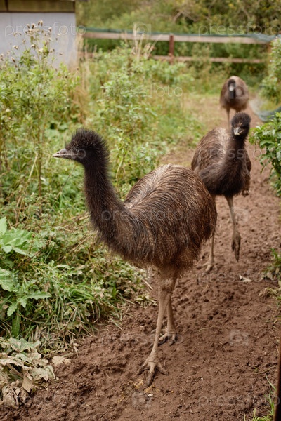 Эмус ходит по грязной дорожке, окруженной зеленой растительностью на открытом воздухе