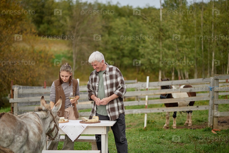 Старший мужчина и молодая взрослая женщина дегустируют сыр на открытом воздухе на ферме