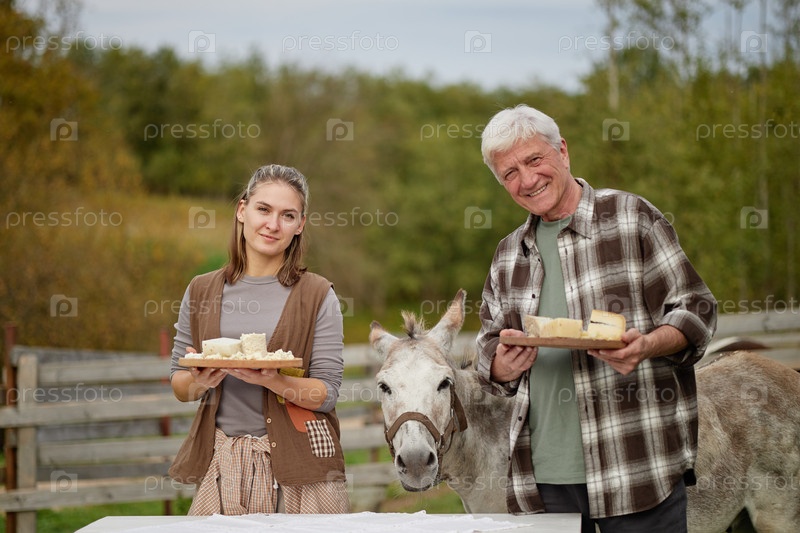 Молодая женщина и старший мужчина представляют сыр на открытом воздухе с ослом