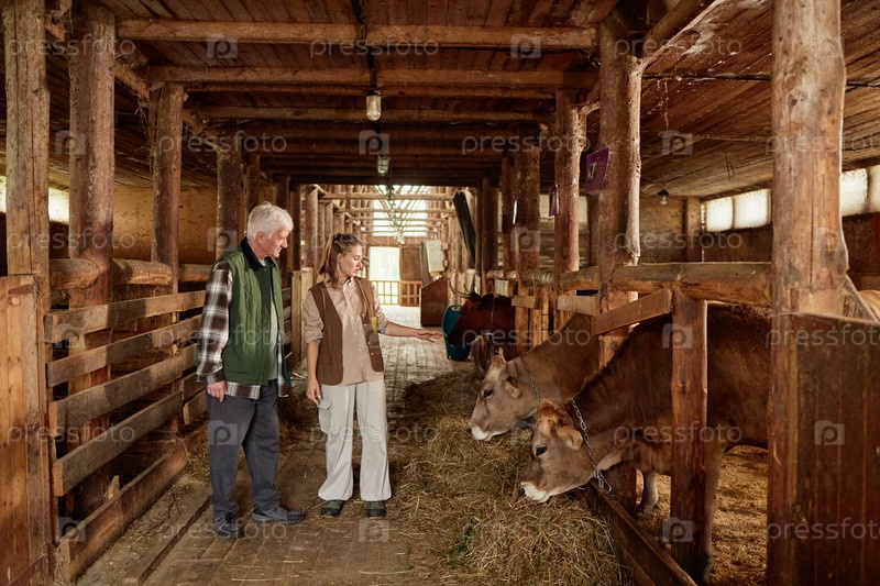 Старший мужчина и молодая женщина кормят коров в сарае
