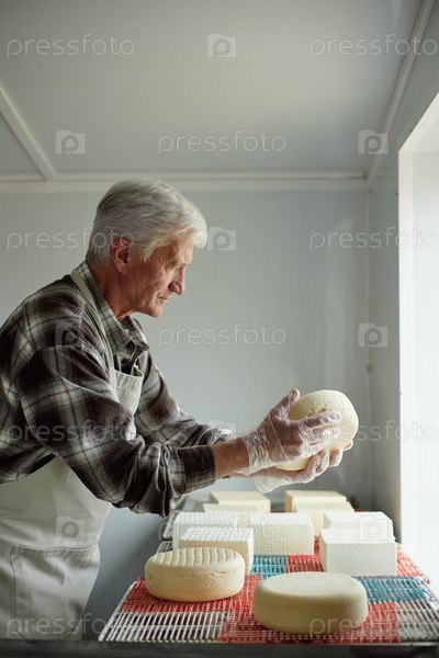 Старший человек, инспектирующий колеса свежего сыра на молочном производстве
