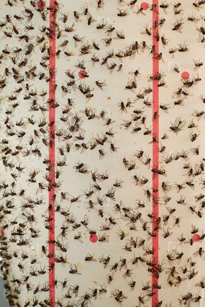 Ближайшее изображение многочисленных мух, прилипающих к клеевой инсектной ловушке для борьбы с вредителями