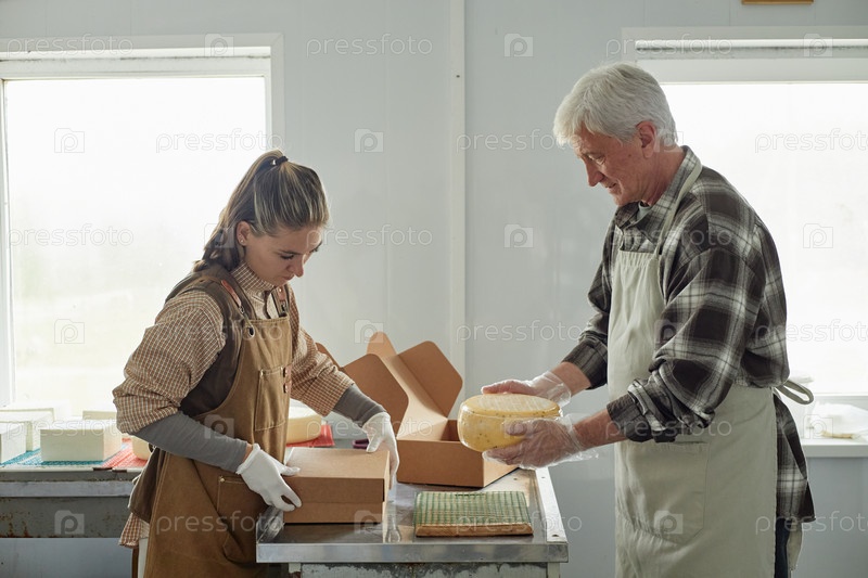 Старший мужчина и молодая взрослая женщина упаковывают сыр вместе на семинаре