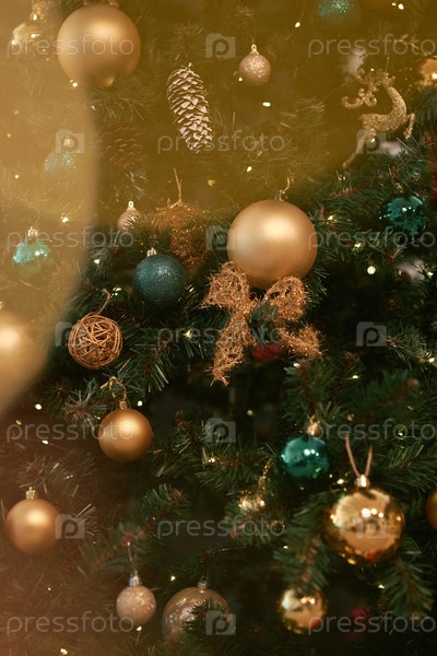 Ветви рождественских деревьев демонстрируют золотые и зеленые орнаменты во время праздничного сезона