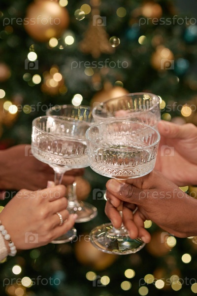 Разнообразная группа взрослых стучат очками, отмечая праздничное событие