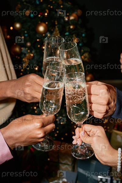 Мультиэтническая группа молодых взрослых, бьющих шампанские бокалы