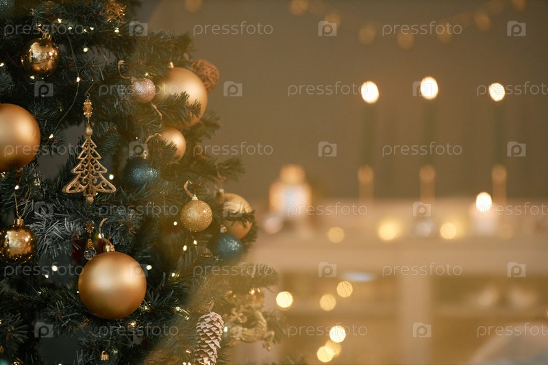 Рождественская елка, украшенная золотыми кубиками и орнаментами в праздничной комнате