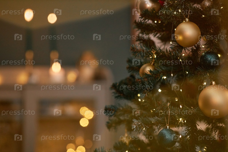 Ветка рождественской елки с золотыми бабками и светящимися в помещении огнями