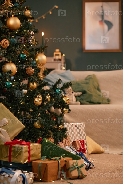 Рождественская елка с подарками, расположенными внизу в уютной обстановке гостиной