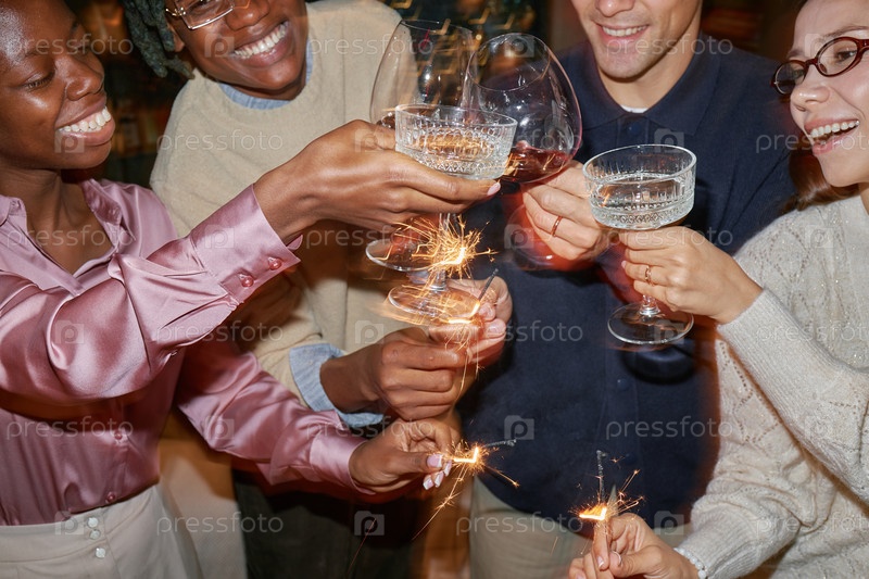 Разнообразные молодые взрослые празднуют вместе, тостируя за напитки и держа в руках искры